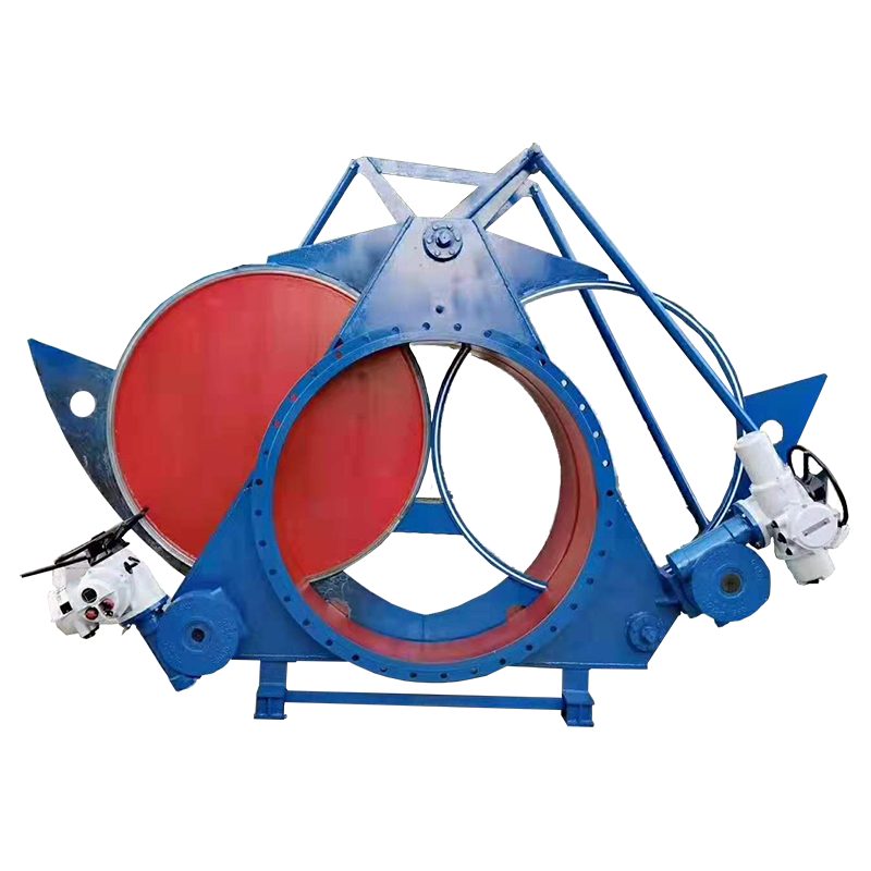 盲板閥由左、右閥體、伸縮機構、扇形閥板及驅動閥板的電動推桿Ⅰ和夾緊、松開的電動推桿Ⅱ組成。